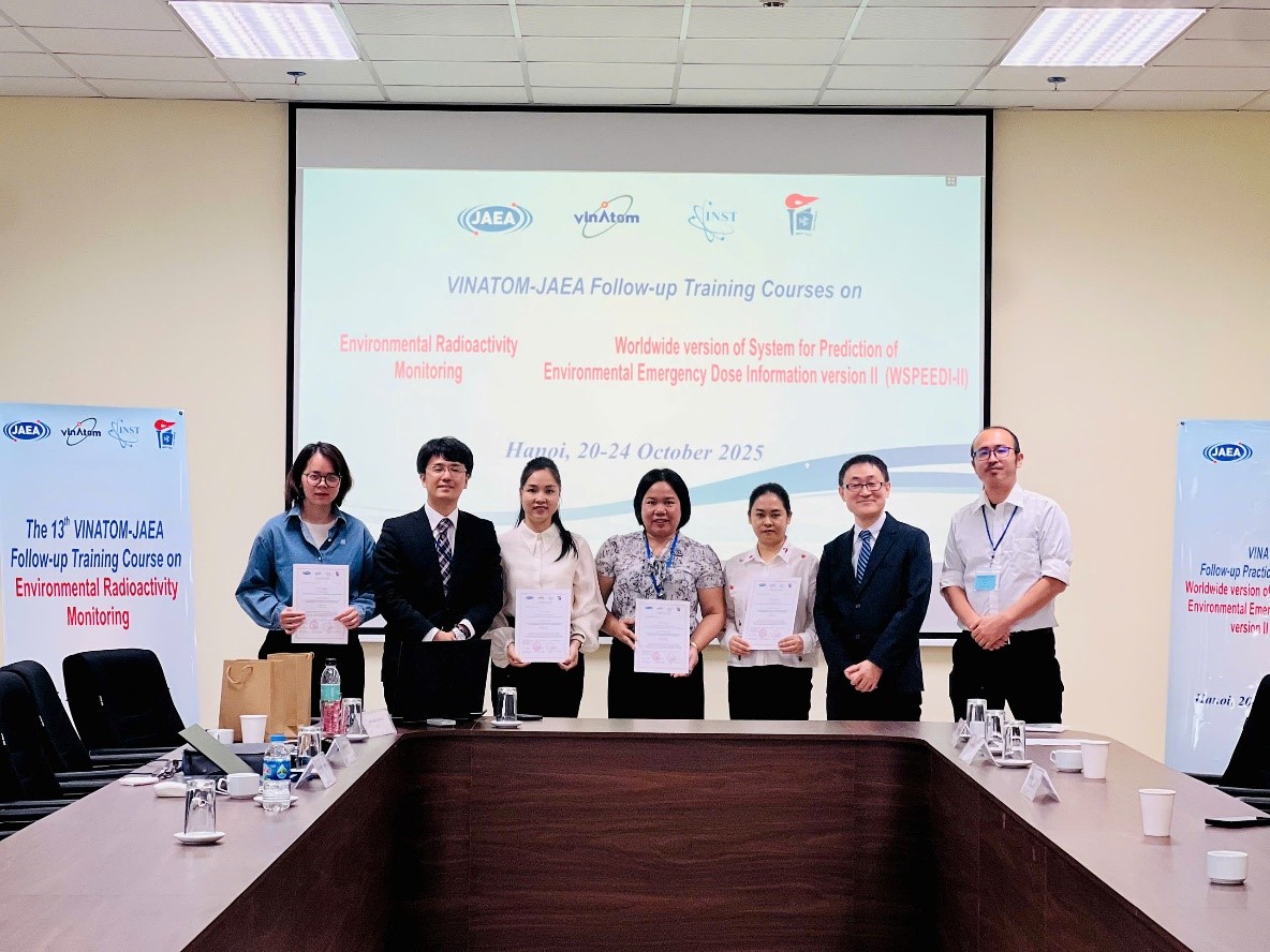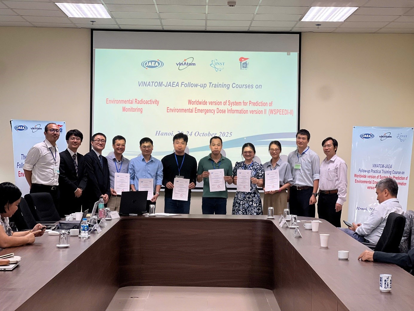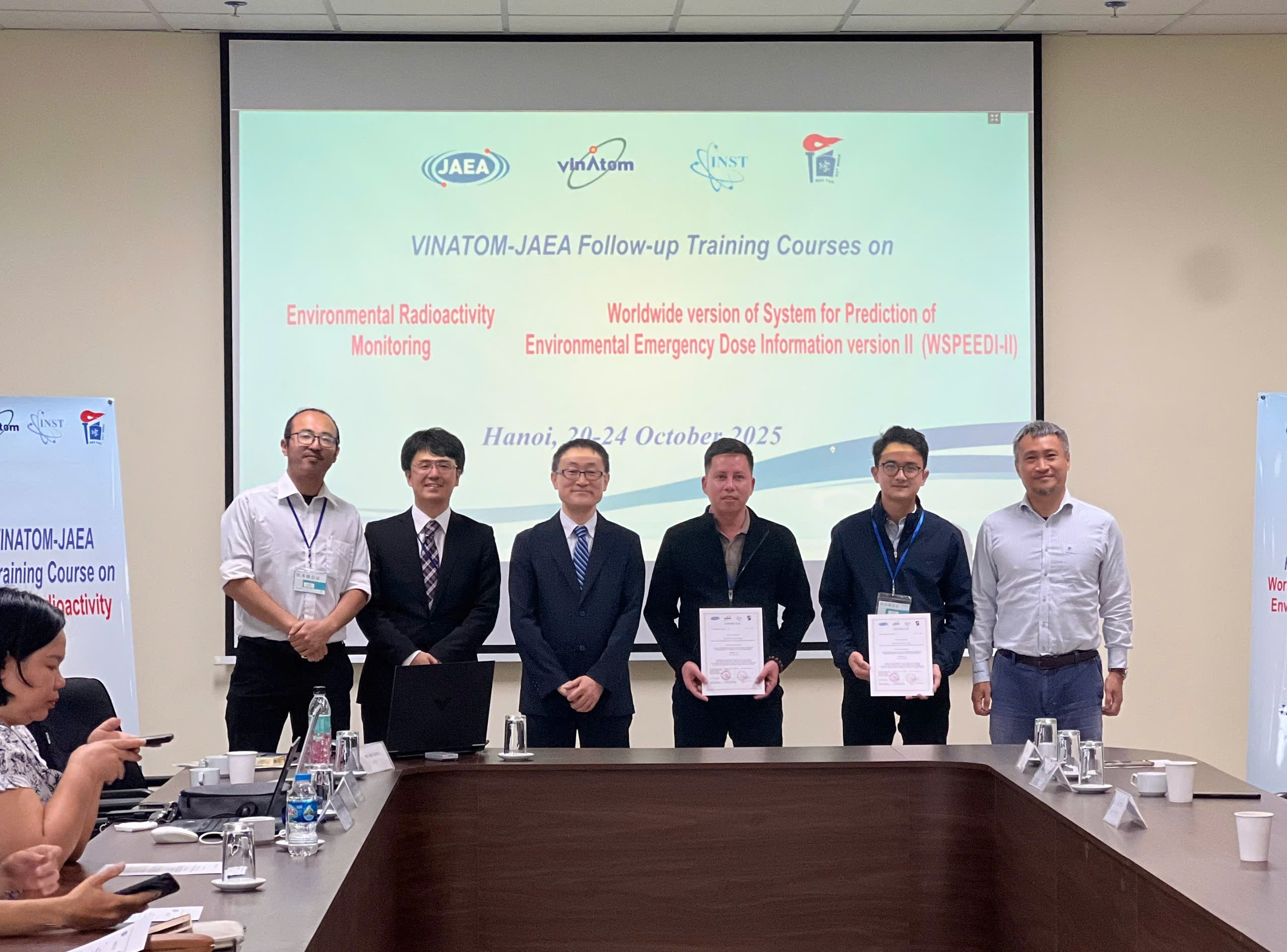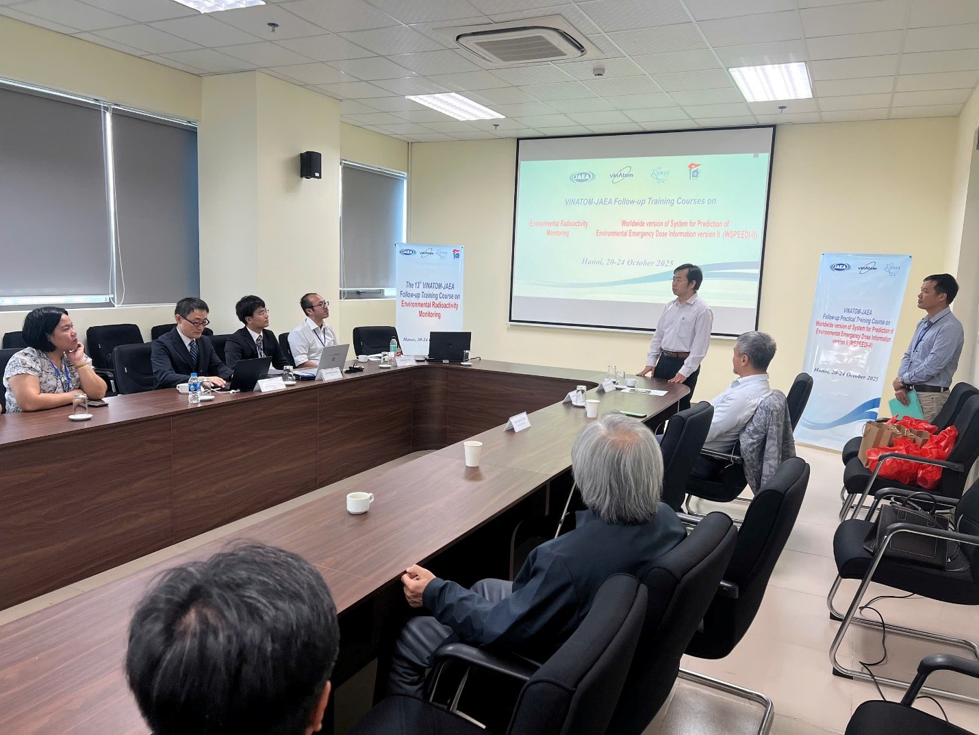 Trong khuôn khổ Chương trình hợp tác đào tạo phát triển nguồn nhân lực về lĩnh vực An toàn và Kiểm soát bức xạ giữa Viện Năng lượng Nguyên tử Việt Nam (VINATOM) và Cơ quan Năng lượng Nguyên tử Nhật Bản (JAEA), Viện Khoa học Kỹ thuật Hạt nhân (KH&KTHN) đã tổ chức khóa đào tạo về “Mô hình đánh giá phán tán phóng xạ trong khí quyển WSPEEDI-II” và “Quan trắc hoạt độ phóng xạ môi trường lần thứ mười ba” tại Trung tâm Hanoi-NuTEC, Viện KH&KTHN. 02 khóa đào tạo diễn ra từ ngày 20-24/10/2025 với sự tham gia giảng dạy, hướng dẫn thực hành của TS. Irie Kenta và TS. Ochi Kotaro đến từ Cơ quan Năng lượng nguyên tử Nhật Bản cùng các giảng viên Việt Nam là các chuyên gia từ Trung tâm Quan trắc phóng xạ và Đánh giá tác động môi trường thuộc Viện KH&KTHN và được thực hiện giám sát bởi Kỹ sư chính cấp cao (Senior Principal Engineer) của JAEA ông OHKURA Takehisa.