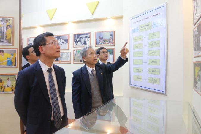 PGS.TS Nguyễn Nhị Điền giới thiệu lịch sử Viện với Bộ trưởng Nguyễn Mạnh Hùng trong chuyến làm việc của Bộ trưởng tại đây, tháng 8/2025. Ảnh: Viện Nghiên cứu hạt nhân