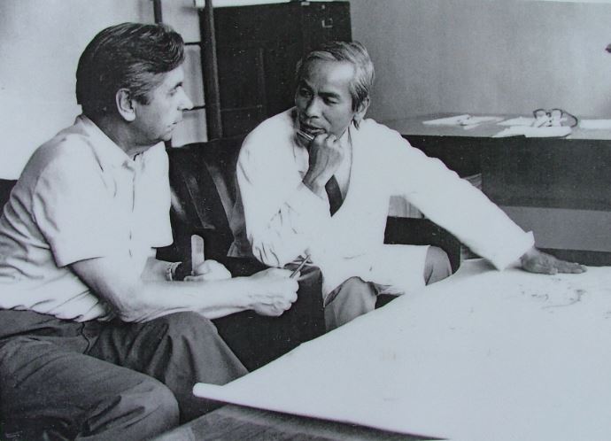 GS. Phạm Duy Hiển (phải) thảo luận với Trưởng đoàn Chuyên gia Liên Xô về kế hoạch triển khai công trình. Ảnh: Viện Nghiên cứu hạt nhân