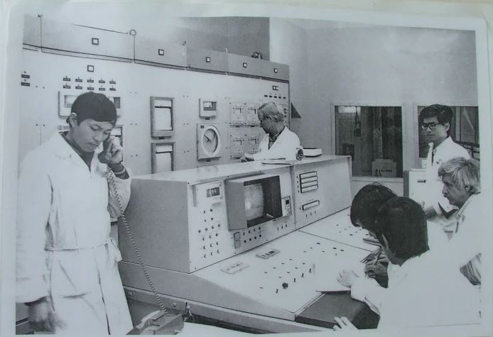 Cán bộ Viện Nghiên cứu hạt nhân Đà Lạt và các chuyên gia Liên Xô trong phòng điều khiển chuẩn bị cho quá trình khởi động lò. Ảnh: Viện Nghiên cứu hạt nhân